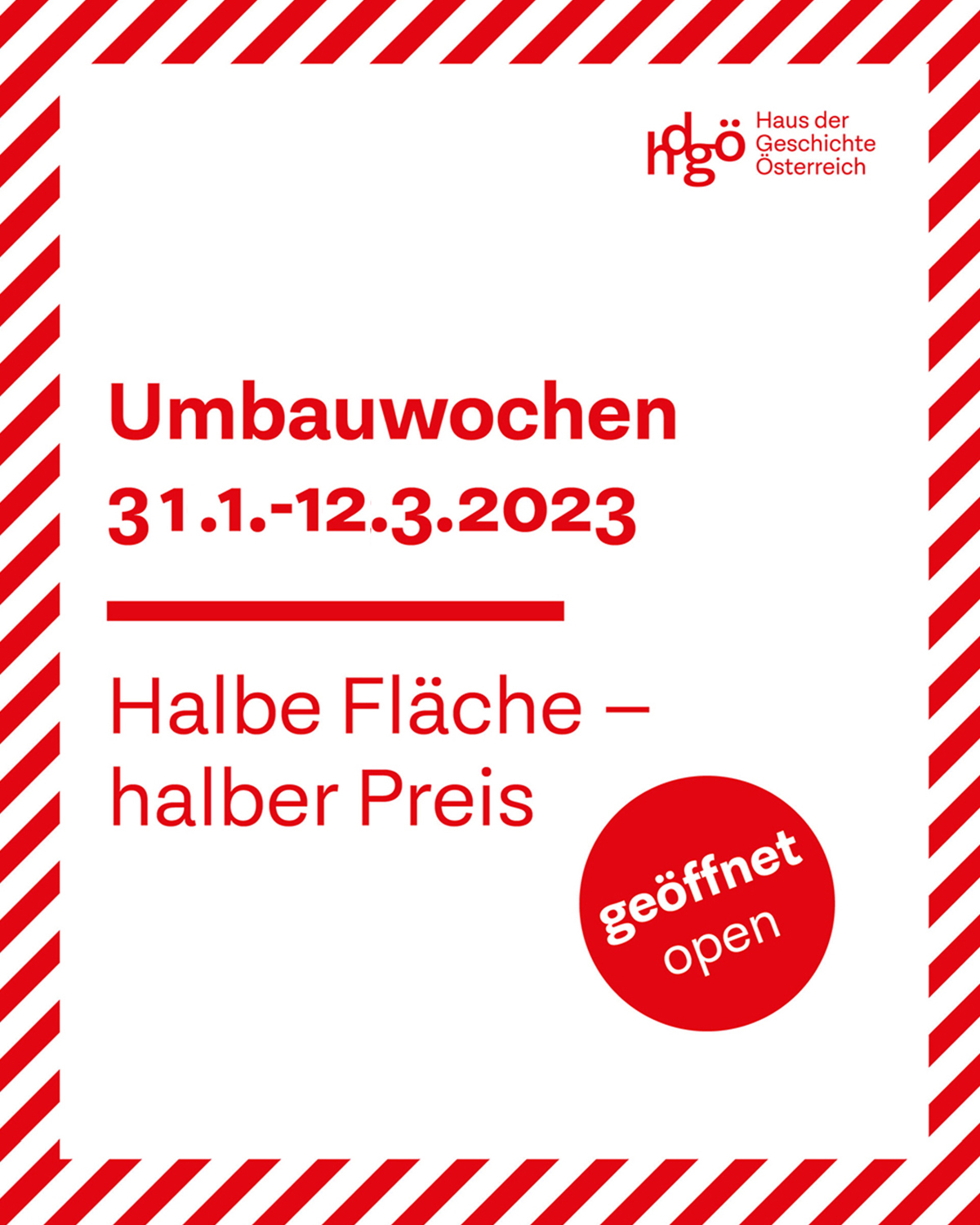 Nicht nur mit dieser Sonderausstellung, auch in unserer Hauptausstellung setzen wir in den kommenden Monaten einen starken thematischen Fokus auf die gesamtgesellschaftlichen Verhandlungen des Erinnerns. Wir gestalten bis 12. März den entsprechenden Bereich unserer Hauptausstellung neu – und bieten Ihnen in dieser Zeit besonders günstige Konditionen für den Museumsbesuch. Unter dem Motto „Halbe Fläche, halber Preis“ besuchen Sie in der Umbau-Zeit unsere Sonderausstellung und den Teilbereich „Chancen einer Zeitenwende“ der Hauptausstellung zum Spezialpreis von EUR 4,50 (Erwachsene) oder EUR 3,50 (mit Ermäßigung).